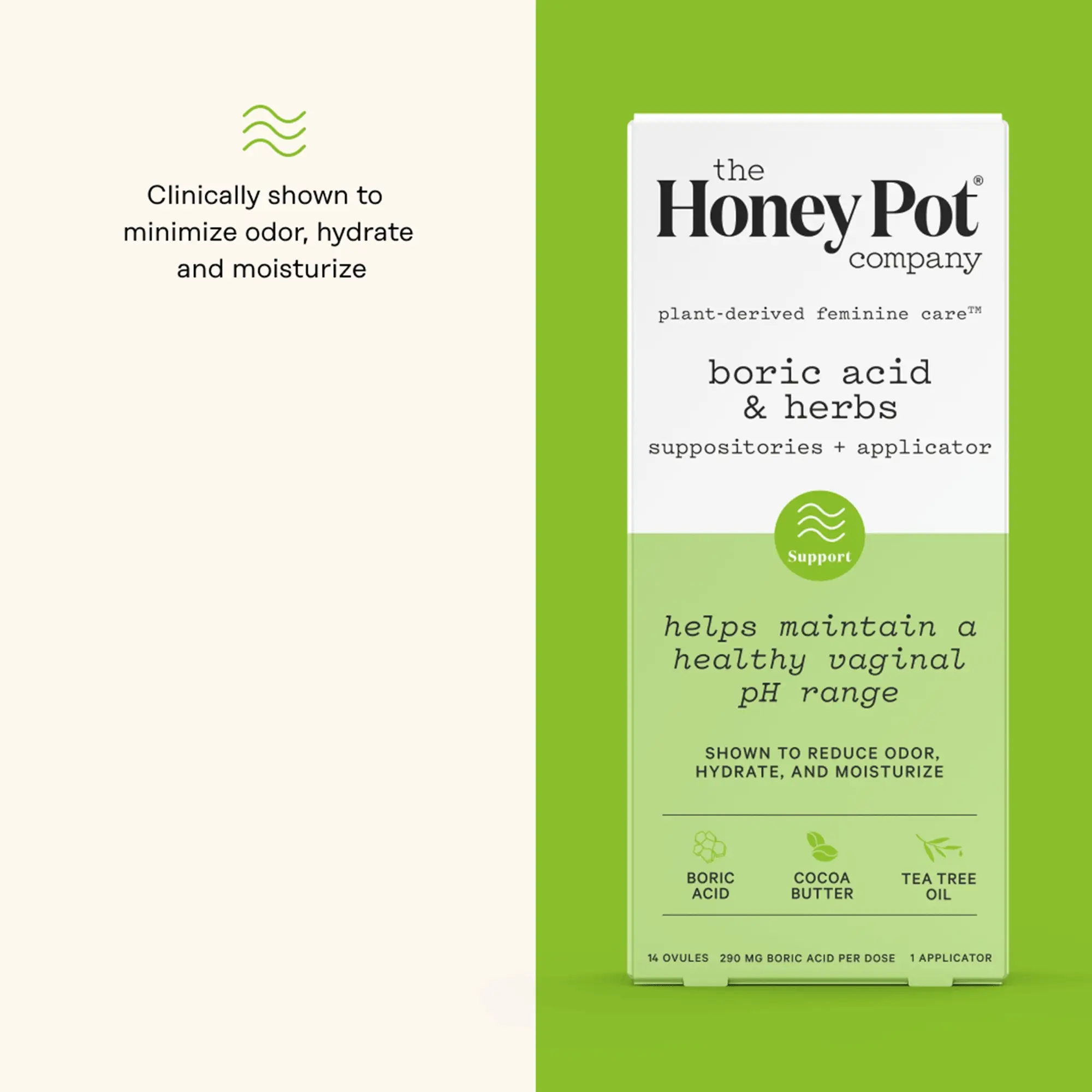 Our suppositories for pH balance are made with boric acid and tea tree oil for balance, plus cocoa butter for an added boost of hydration and moisture. Boric acid vaginal suppositories can be used during menstruation, but do not use with tampons.