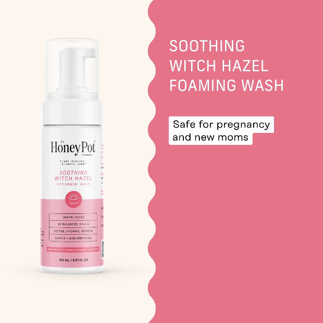 Our most soothing intimate wash is formulated with witch hazel to gently cleanse and comfort delicate intimate skin. Thoughtfully designed for new moms and moms-to-be, this wash helps you feel refresed, confident, and balanced after every cleanse. The Honey Pot’s Soothing Witch Hazel Intimate Wash is clinically shown to soothe and help maintain a healthy vaginal pH range. Infused with plant-derived* ingredients and witch hazel while delivering a gental, non-irritating cleanse suitable for sensitive external skin.